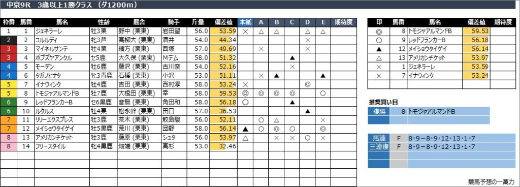 中京9R 3歳以上1勝クラス (ダ1200m)