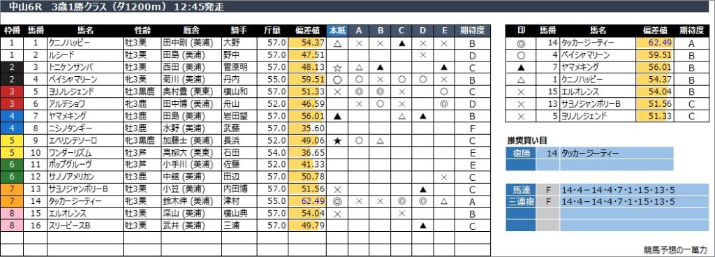 中山6R 3歳1勝クラス(ダ1200m) 12:45発走