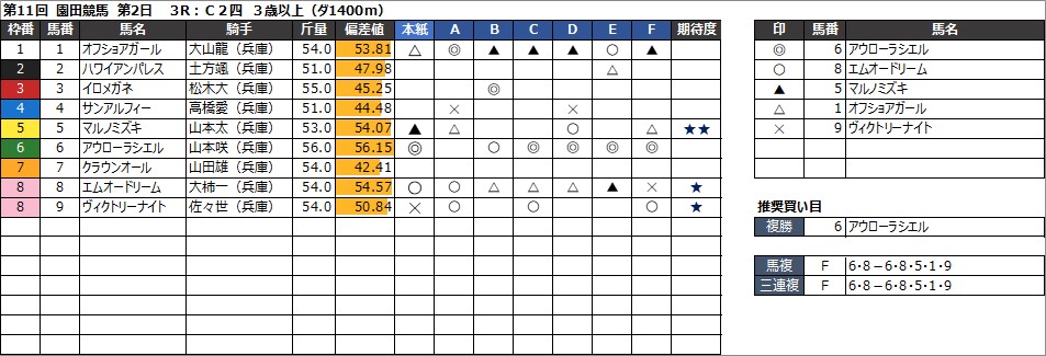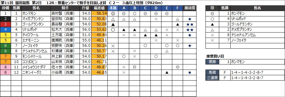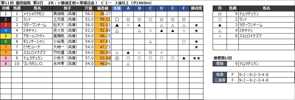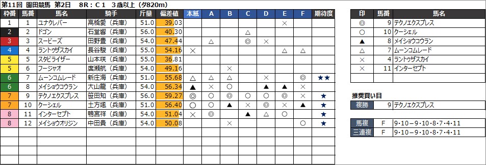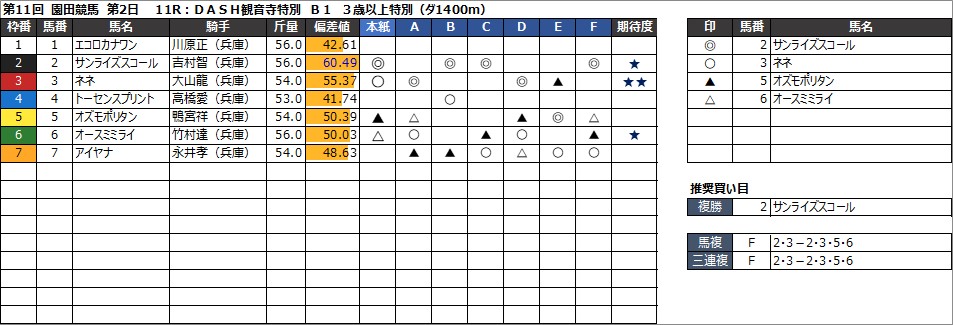 園田競馬予想 8月15日(木) DASH観音寺特別 他