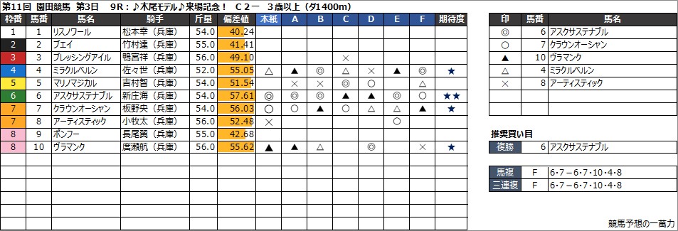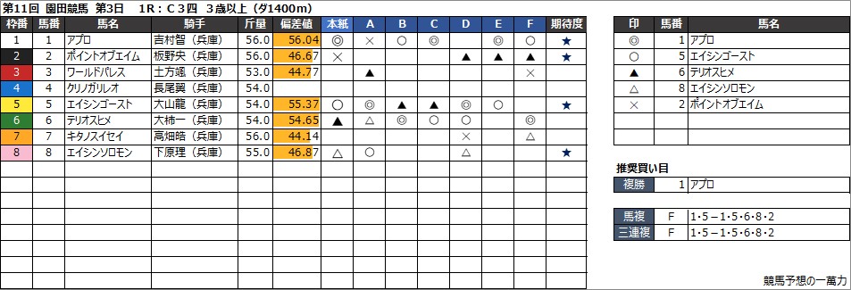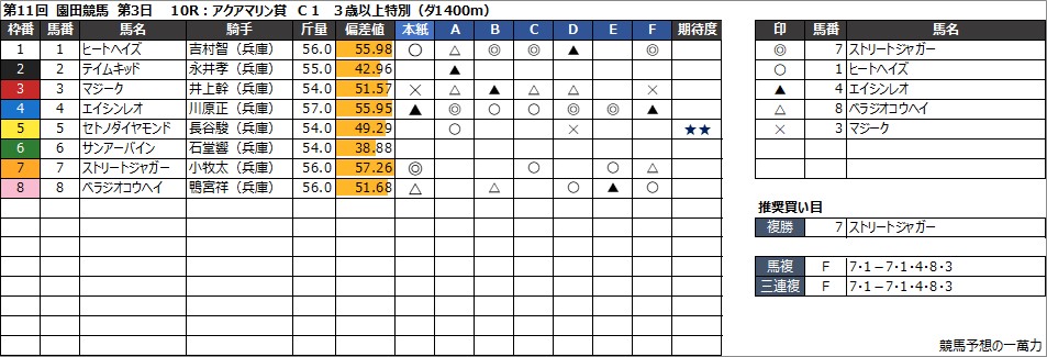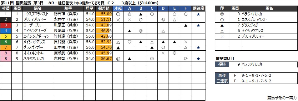園田競馬予想 8月16日(金) 摂津盃 他