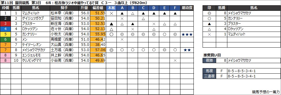 6R:桂吉弥ラジオ中継やってるで賞 C3一 3歳以上(ダ820m)