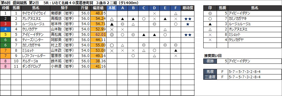 5R:いわて北緯40度葛巻町賞 3歳B2二組(ダ1400m)