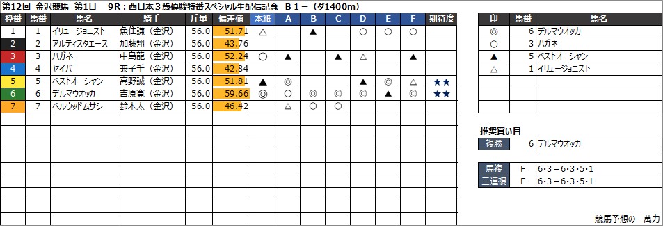 金沢競馬予想 9月1日(日) 西日本3歳優駿 他