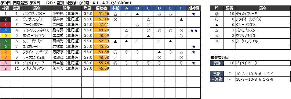 12R:登別 地獄まつり特別 A1 A2(ダ1800m)