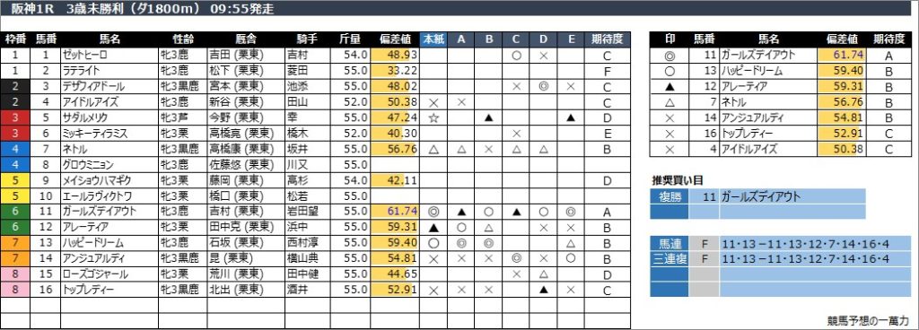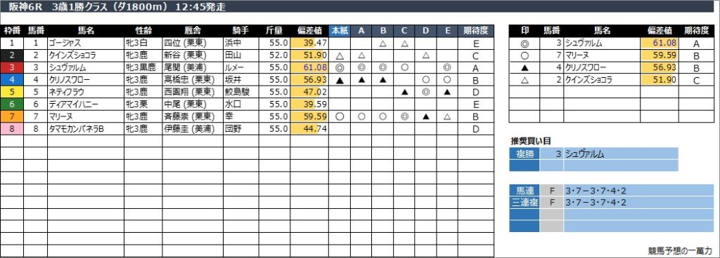 阪神6R 3歳1勝クラス(ダ1800m) 12:45発走
