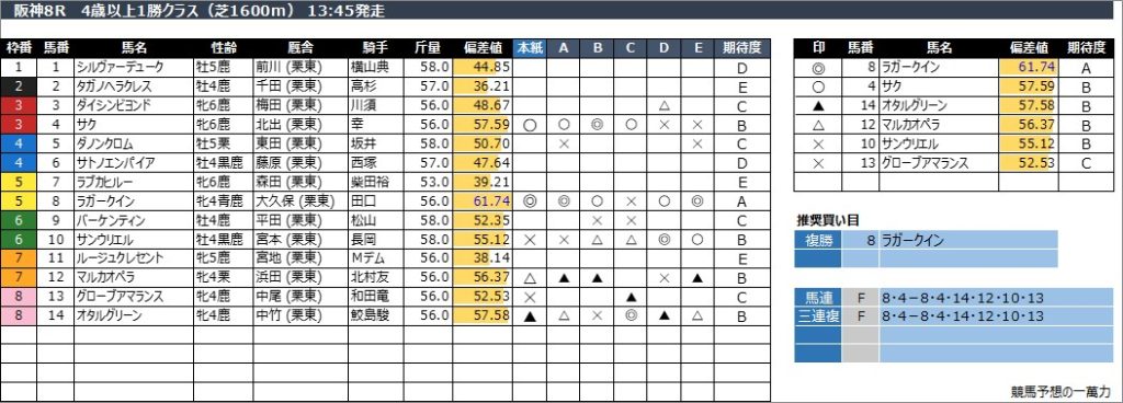 阪神8R 4歳以上1勝クラス(芝1600m) 13:45発走