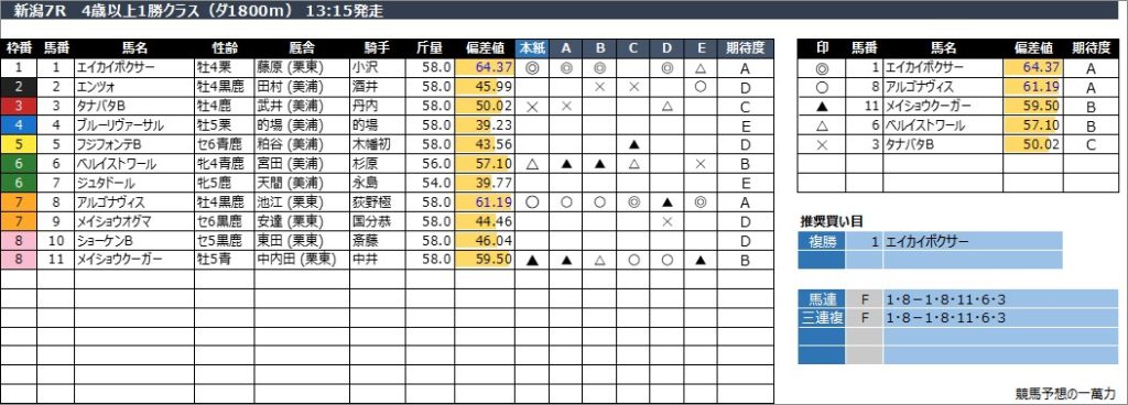 新潟7R 4歳以上1勝クラス(ダ1800m) 13:15発走