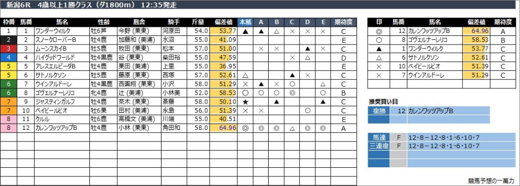 新潟6R 4歳以上1勝クラス(ダ1800m) 12:35発走