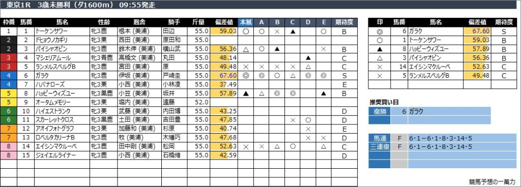 東京1R 3歳未勝利(ダ1600m) 09:55発走