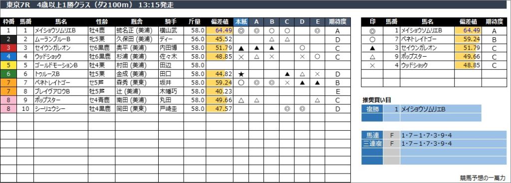 東京7R 4歳以上1勝クラス(ダ2100m) 13:15発走
