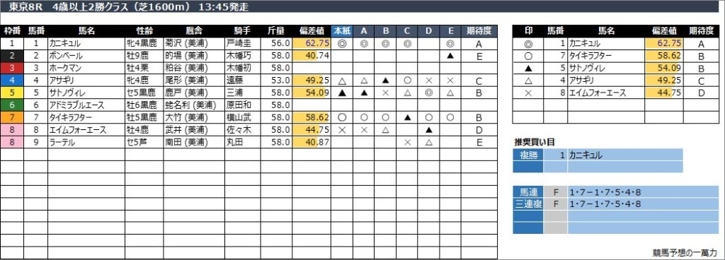 東京8R 4歳以上2勝クラス(芝1600m) 13:45発走