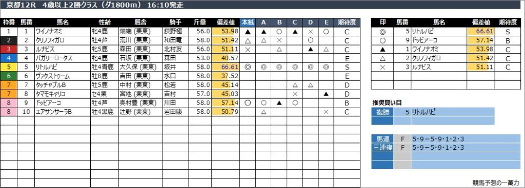 京都12R  4歳以上2勝クラス(ダ1800m) 16:10発走