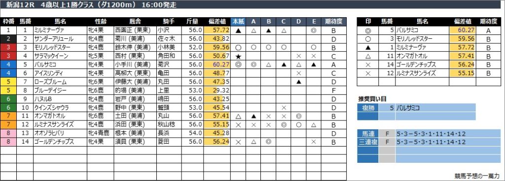 新潟12R 4歳以上1勝クラス(ダ1200m) 16:00発走