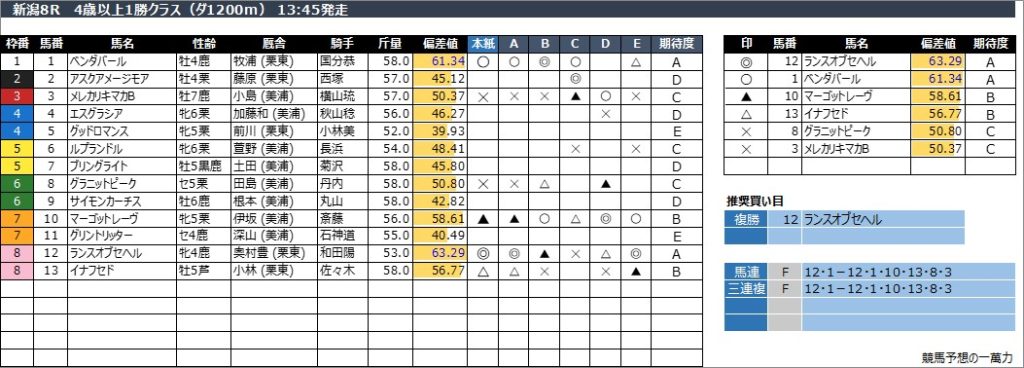 新潟8R 4歳以上1勝クラス(ダ1200m) 13:45発走