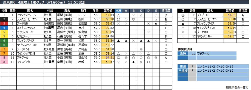 東京8R 4歳以上1勝クラス(ダ1600m) 13:55発走