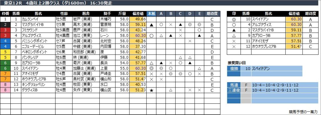 東京12R  4歳以上2勝クラス(ダ1600m) 16:30発走
