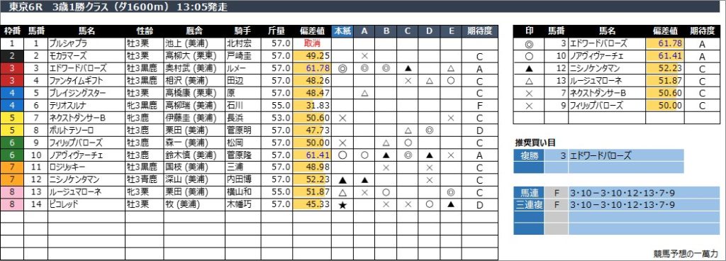 東京6R  3歳1勝クラス(ダ1600m) 13:05発走