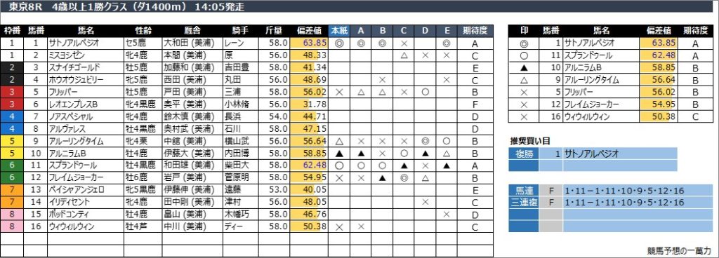 東京8R  4歳以上1勝クラス(ダ1400m) 14:05発走