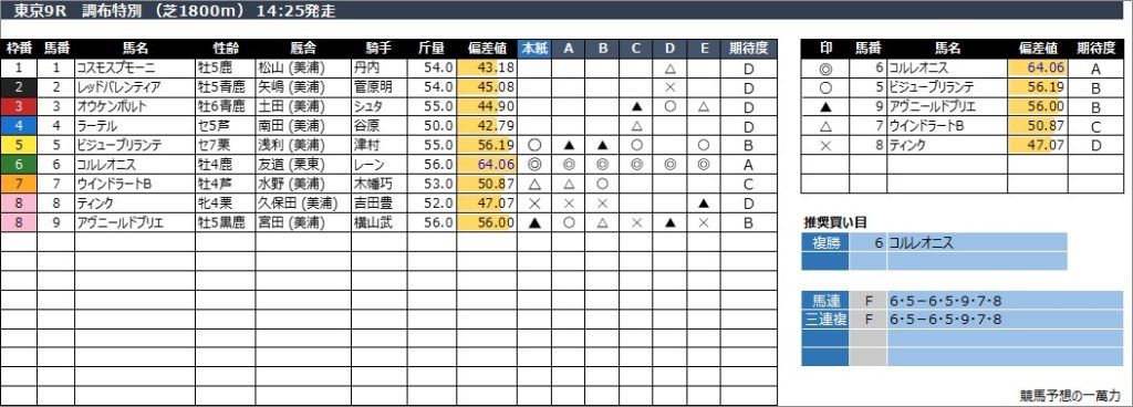 東京9R 調布特別 (芝1800m) 14:25発走