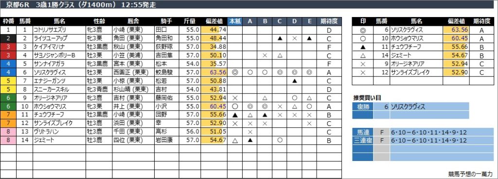 京都6R 3歳1勝クラス(ダ1400m) 12:55発走