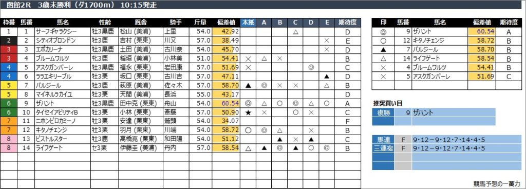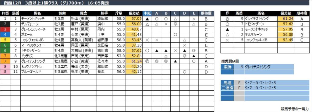 函館12R  3歳以上1勝クラス(ダ1700m) 16:05発走
