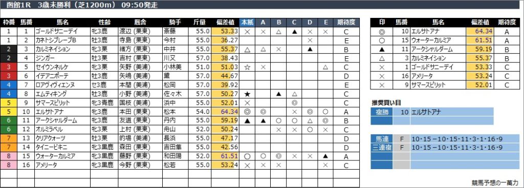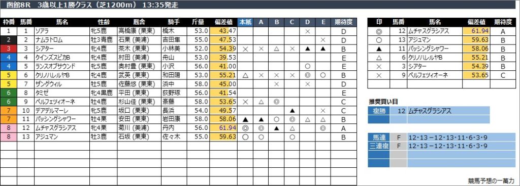 函館8R  3歳以上1勝クラス(芝1200m) 13:35発走