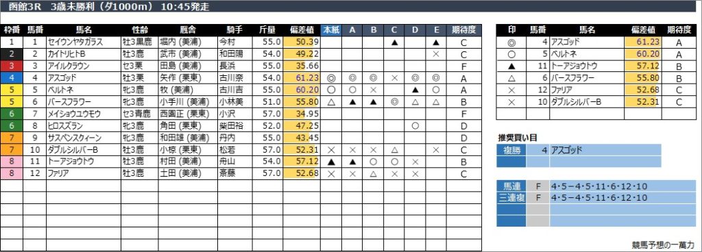 函館3R  3歳未勝利(ダ1000m) 10:45発走