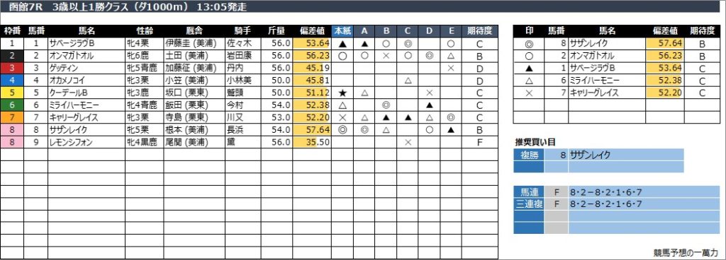 函館7R  3歳以上1勝クラス(ダ1000m) 13:05発走