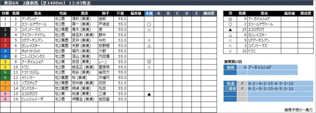 東京6R 2歳新馬(芝1400m) 13:05発走