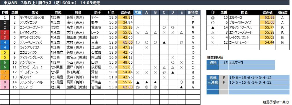 東京8R 3歳以上1勝クラス(芝1600m) 14:05発走