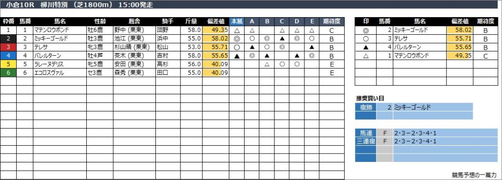 小倉10R 柳川特別 (芝1800m) 15:00発走