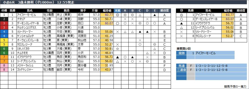 小倉6R 3歳未勝利(ダ1000m) 12:55発走