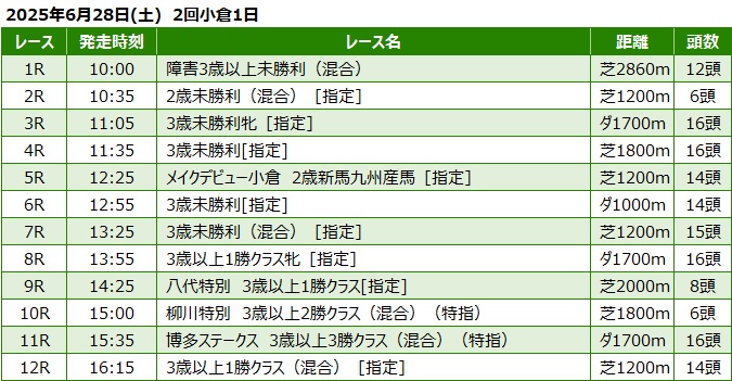 2025年6月28日(土) 小倉競馬の全レース予想です。