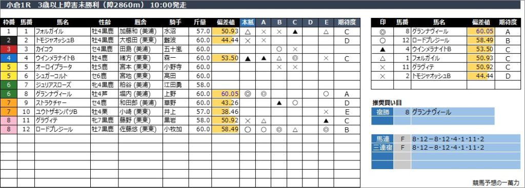 小倉1R 3歳以上障害未勝利(障2860m) 10:00発走