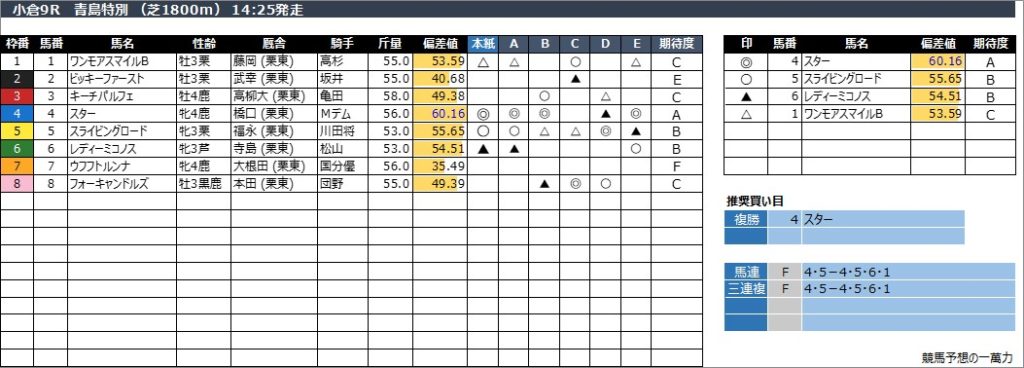 小倉9R 青島特別 (芝1800m) 14:25発走
