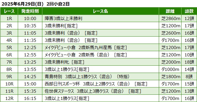 2025年6月29日(日) 小倉競馬の全レース予想です。