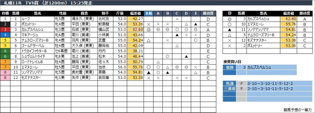 札幌11R TVh賞 (芝1200m) 15:25発走