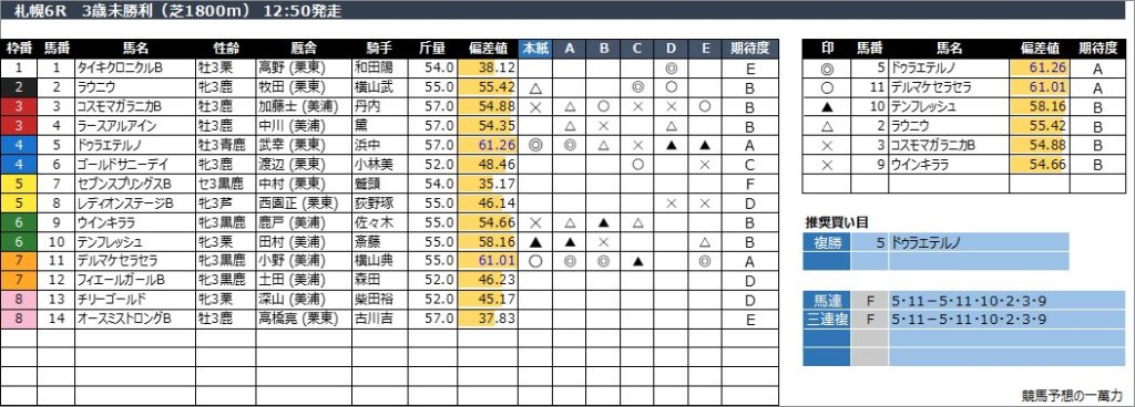 札幌6R 3歳未勝利(芝1800m) 12:50発走