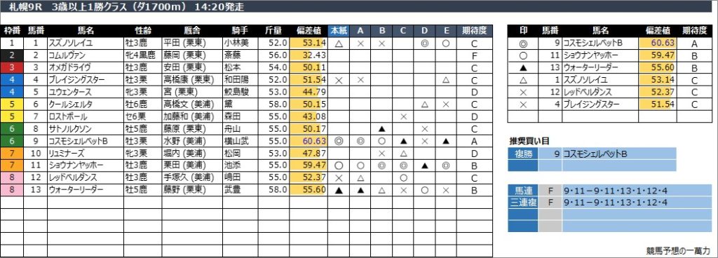 札幌9R 3歳以上1勝クラス(ダ1700m) 14:20発走