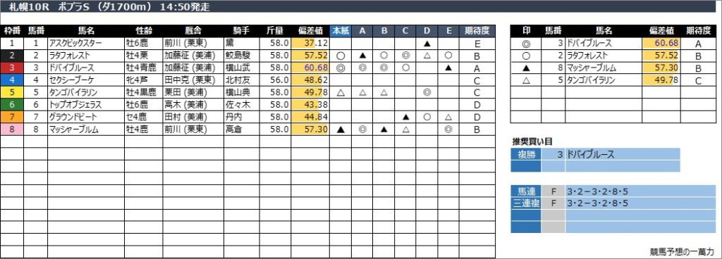 札幌10R  ポプラS (ダ1700m) 14:50発走
