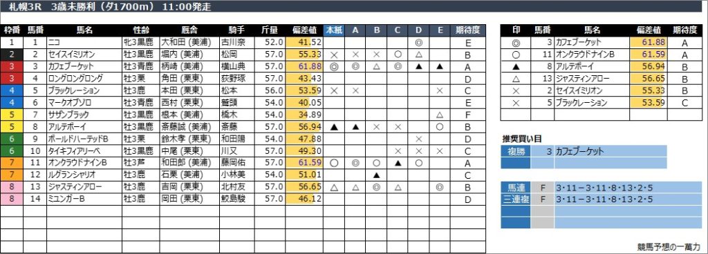 札幌3R  3歳未勝利(ダ1700m) 11:00発走
