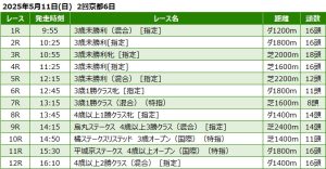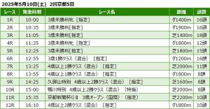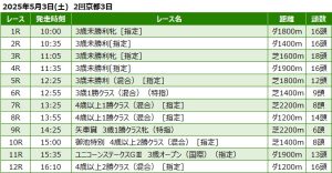 2025年5月3日(土) 京都競馬の全レース予想です。 京都競馬場の天気予報は晴のち雨。当日朝の馬場状態は・芝:稍重・ダート:重となっています。 本日の京都メインは 第30回 ユニコーンステークス(GIII)ダート190 […]