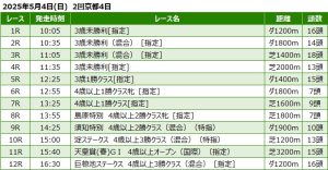 2025年5月4日(日) 京都競馬の全レース予想です。 京都競馬場の天気予報は晴時々曇。当日朝の馬場状態は・芝:良・ダート:稍重となっています。 本日の京都メインは 第171回 天皇賞(春) (GI)芝3200メートル、 […]