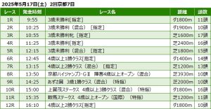 2025年5月17日(土) 京都競馬の全レース予想です。 京都競馬場の天気予報は雨時々曇。当日朝の馬場状態は・芝:稍重・ダート:稍重となっています。